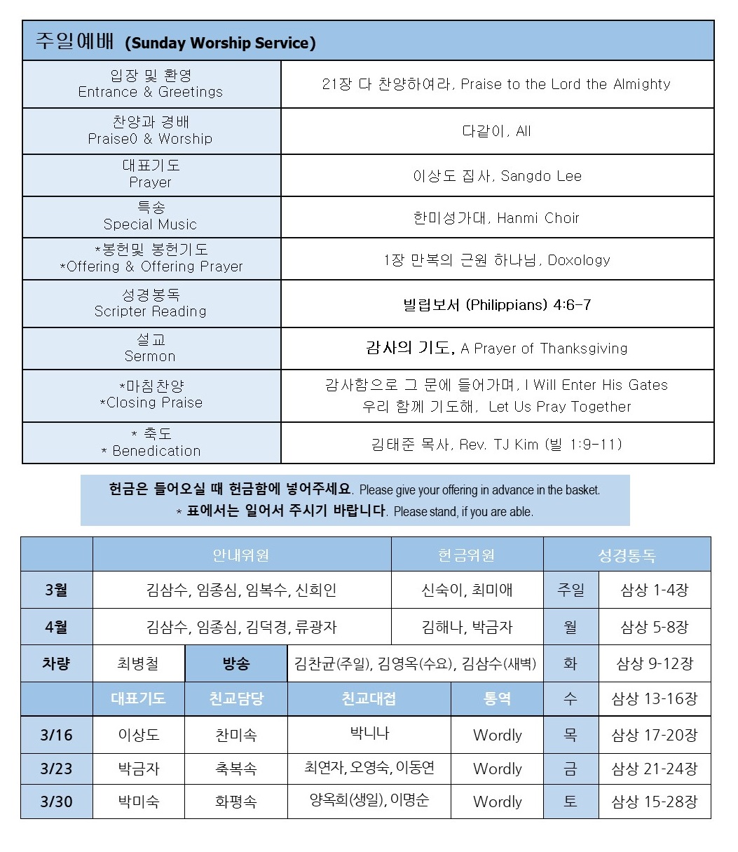 * 사순절 둘째 주일 예배에 참석하신 여러분을 주님의 이름으로 환영합니다! * 예배 후에는 지하 친교실에서 점심 식사가 있습니다, 오늘 처음 방문하신 분들은 친교실에 마련된 새가족 테이블에서 담임 목사님과 함께 식사를 해 주시면 감사하겠습니다.