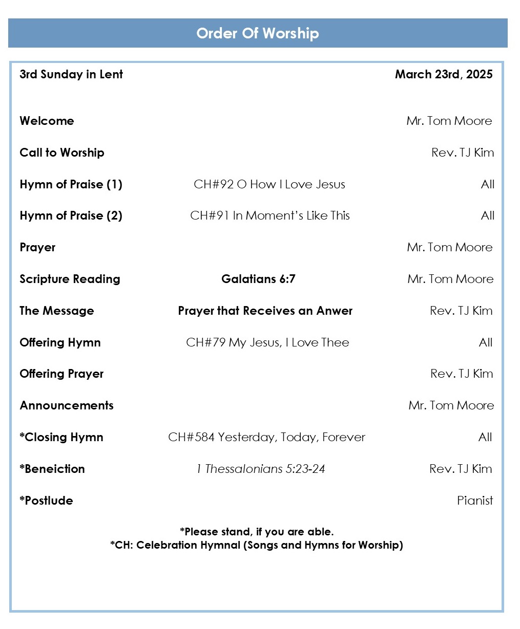* Prayer request cards (beige) and prayer answer cards (blue) are available at the Prayer Center. If you have received an answer to your prayers, please write it on a prayer answer card and place it in the prayer box so that we can share the joy and give glory to God together. (Each week, one prayer answer card will be selected, and a gift will be given.)