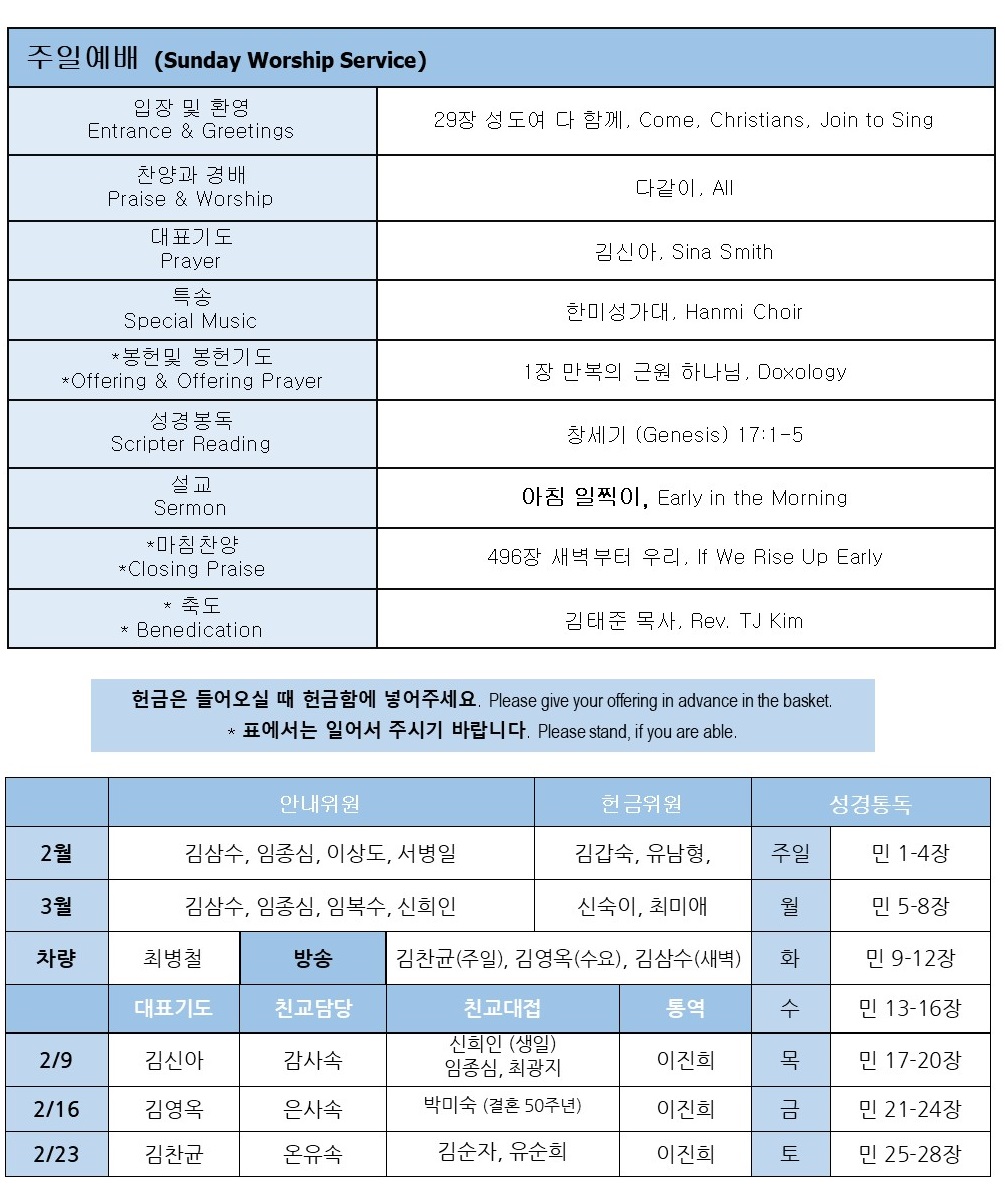 * 오늘 귀한 주일 예배에 참석하신 여러분을 주님의 이름으로 환영합니다! * 예배후에는 지하 친교실에서 점심 식사가 있습니다, 오늘 처음 방문하신 분들은 친교실에 마련된 새가족 테이블에서 담임 목사님과 함께 식사를 해 주시면 감사하겠습니다.