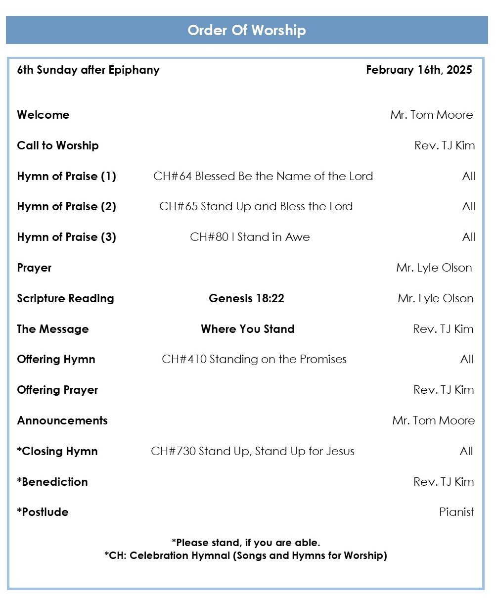 * We warmly welcome Mehee Lee and Helen Mann as a new member to our church family.