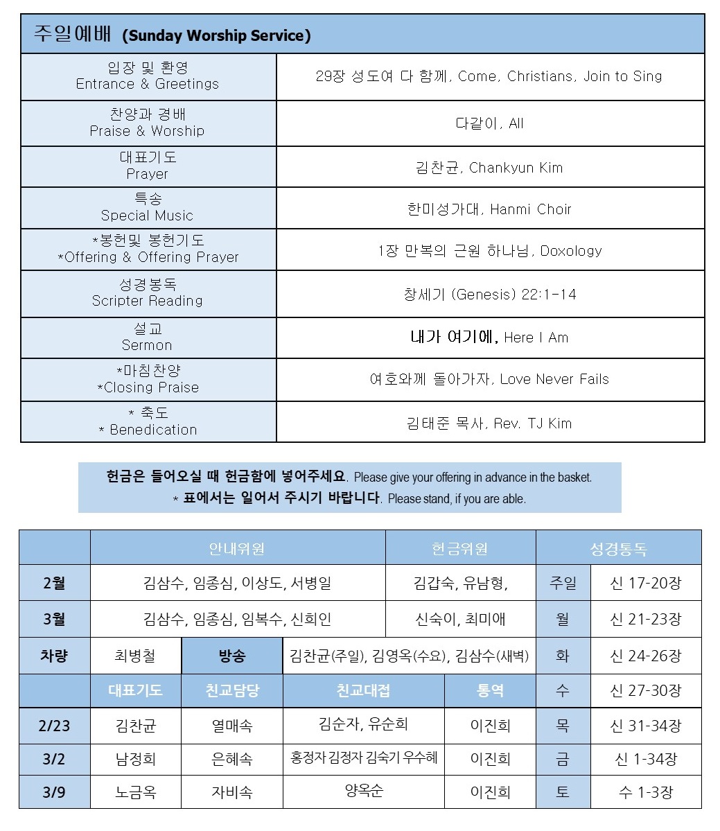 * 오늘 귀한 주일 예배에 참석하신 여러분을 주님의 이름으로 환영합니다! * 예배후에는 지하 친교실에서 점심 식사가 있습니다, 오늘 처음 방문하신 분들은 친교실에 마련된 새가족 테이블에서 담임 목사님과 함께 식사를 해 주시면 감사하겠습니다.