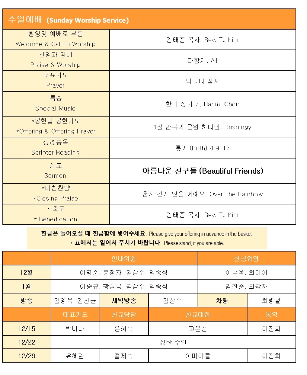 * 성탄주일 예배가 12월 22일 , 오전 11시에 합동예배로 드려집니다.