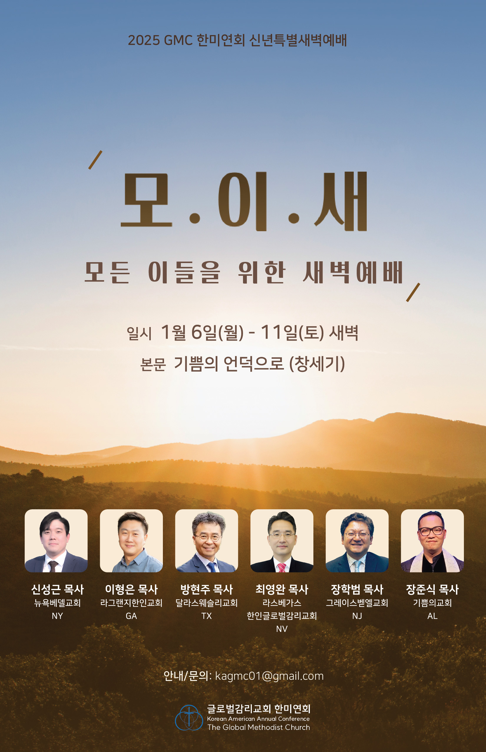 한미연회 신년 특별 새벽예배 안내 페이지 정보 작성자 한미감리교회 조회 274회 작성일 25-01-06 15:30 목록 본문 한미연회 신년 특별 새벽예배가 1월 6일(월) - 1월 11일(토) 동안 있습니다.저희 한미감리교회는 1월 6일(월) - 1월 10일(금) 동안 참여합니다.많은 참여 부탁드립니다 댓글 0 댓글목록 등록된 댓글이 없습니다. 목록