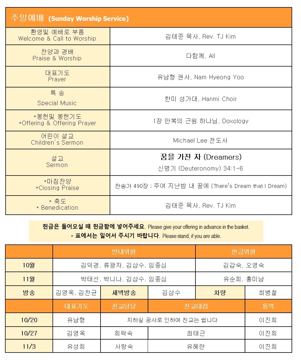 * 오늘 중고등부는 2부 예배에 함께 하겠습니다. 어린이주는 어린이 설교후에 Pumkin Patch 활동이 이어집니다. 학부모님들의 많은 협조 부탁드립니다.