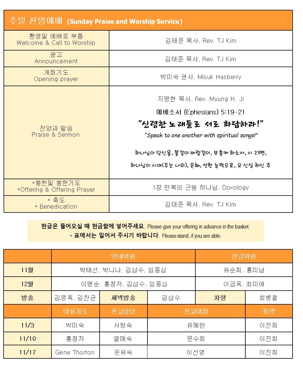 * 11/24 (주일), 11:00 am, 추감사주일 합동 예배