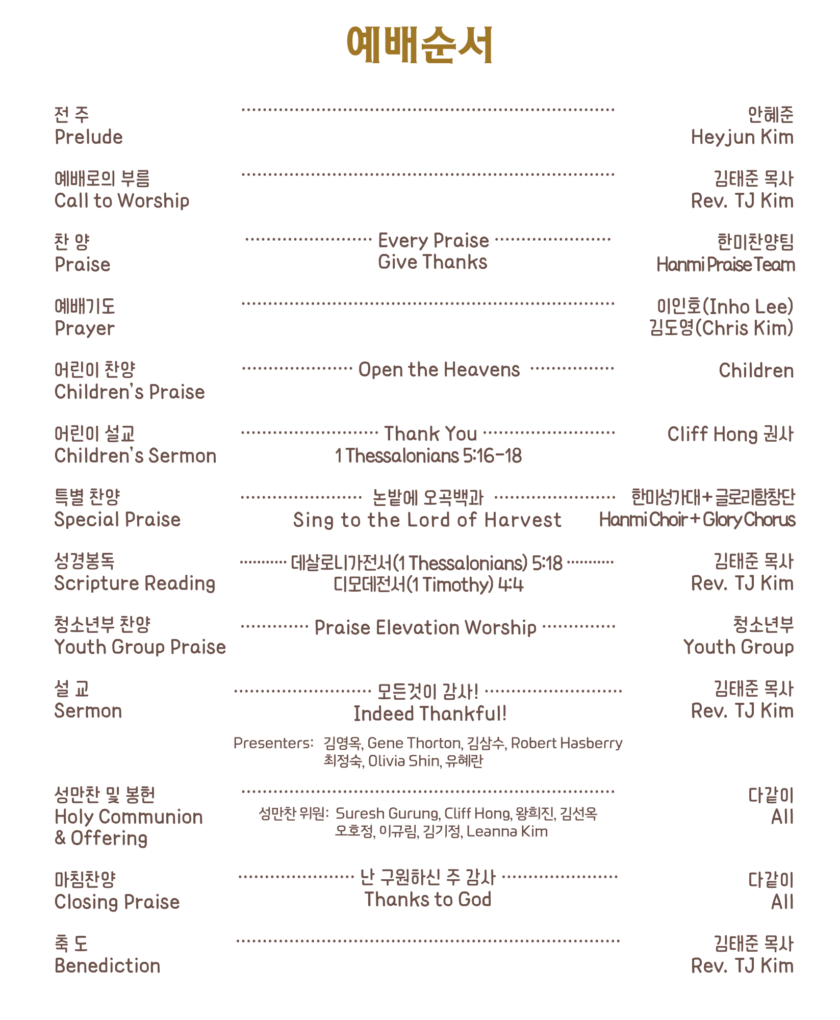 * 강단 장식과 예배의 여러 순서를 맡아준 여러분께 감사를 드립니다. 여러분의 수고로 감사의 지경이 넓혀진 예배가 되었기에 감사드립니다. * 감사의 기쁨이 넘치는 귀한 만찬을 준비해 주신 여선교회 여러분께 감사를 드립니다.