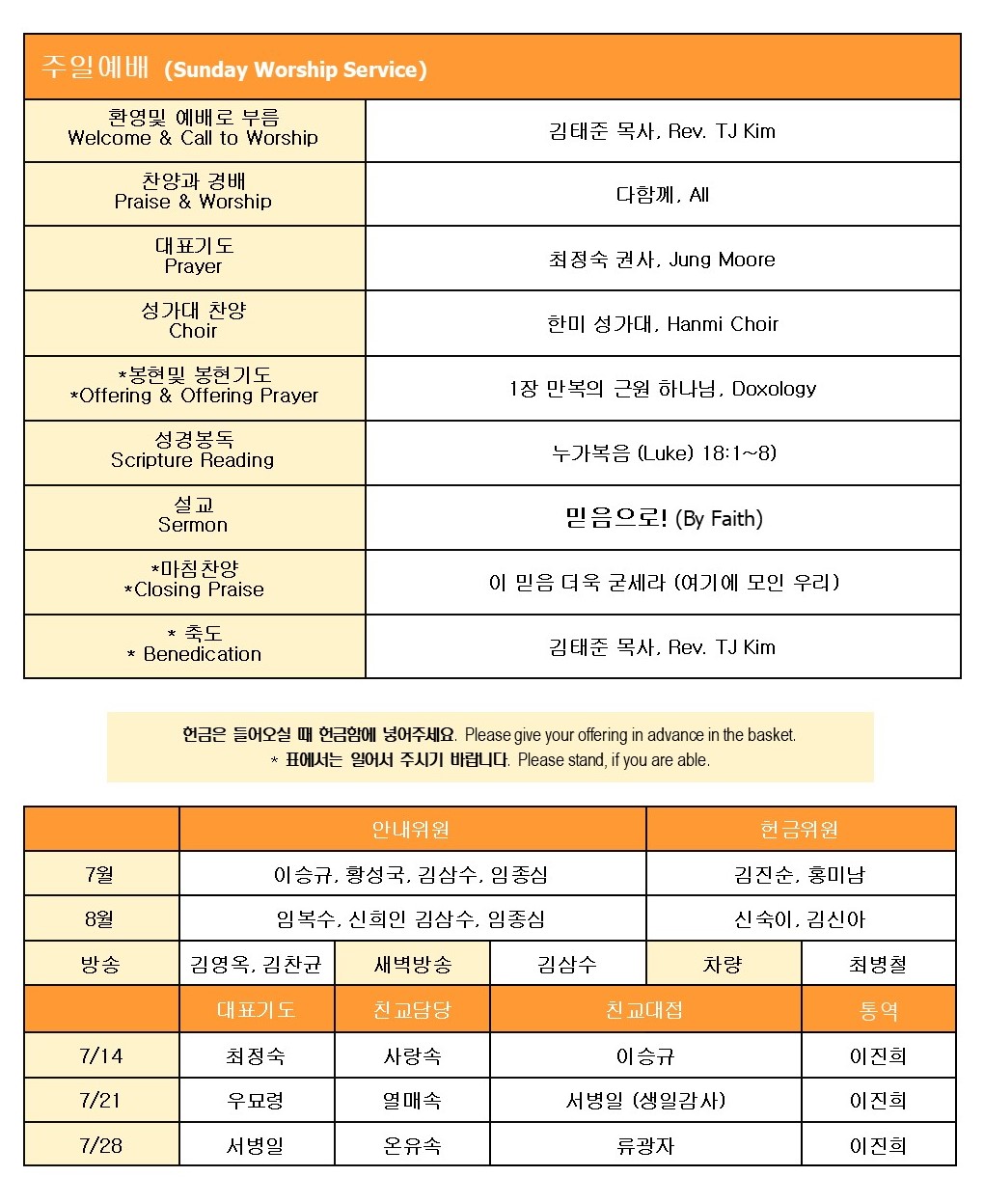 * 7월 수요예배는 주기도문을 묵상하며 기도하는 찬양기도회로 드려집니다. 많은 참여를 바랍니다.