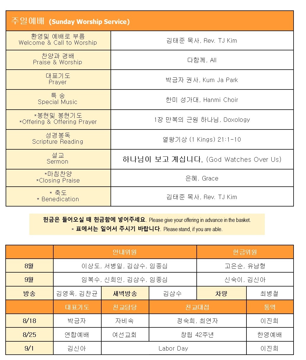 * 8/25 (주일) ,11 am 창립 42주년 감사예배