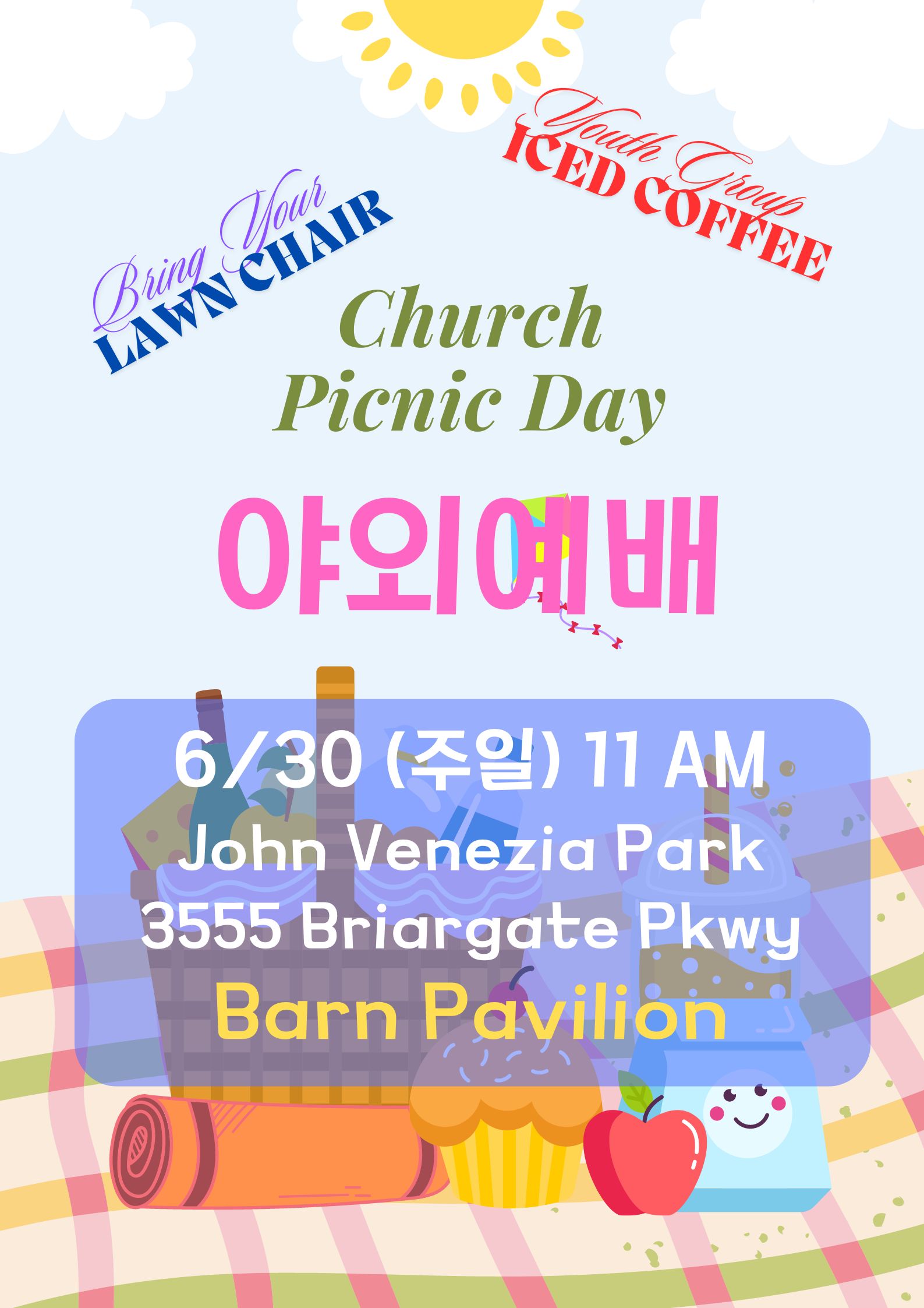 * 오늘 야외 예배에 참석하신 여러분을 주님의 이름으로 환영합니다! 하나님께서 지으신 자연 가운데 귀한 쉼과 기쁨의 교제를 나누실 수 있기를 바랍니다. 식사후에 푸짐한 상품과 함께 온 교우가 참여하는 게임이 준비되어 있습니다. 즐거운 교제의 시간이 되길 바랍니다. 환영합니다!