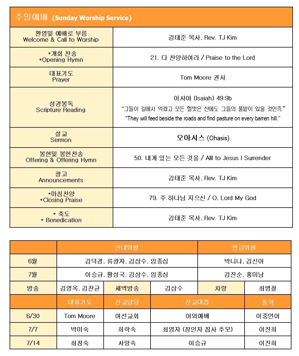 * 24년도 중간 재정 보고를 위한 교인 총회가 7월 7일 주일 예배후에 있겠습니다.