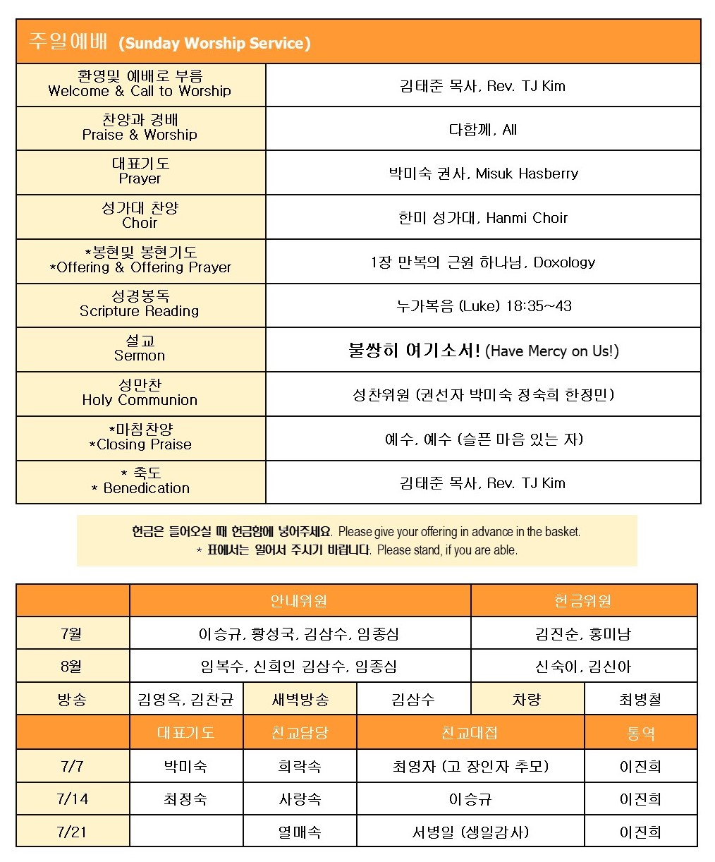 * 중고등부 White Water Rafting 이 7월 25일에 있습니다. *중고등부 여름 수양회가 8월 1일부터 3일까지 Ponderosa Retreat Center에서 덴버지역 교회들과 함께 연합으로 있습니다. 회비는 170불로 교회에서 100불을 지원 합니다. 등록 문의는 이마이클 권사님께 해 주시기 바랍니다.