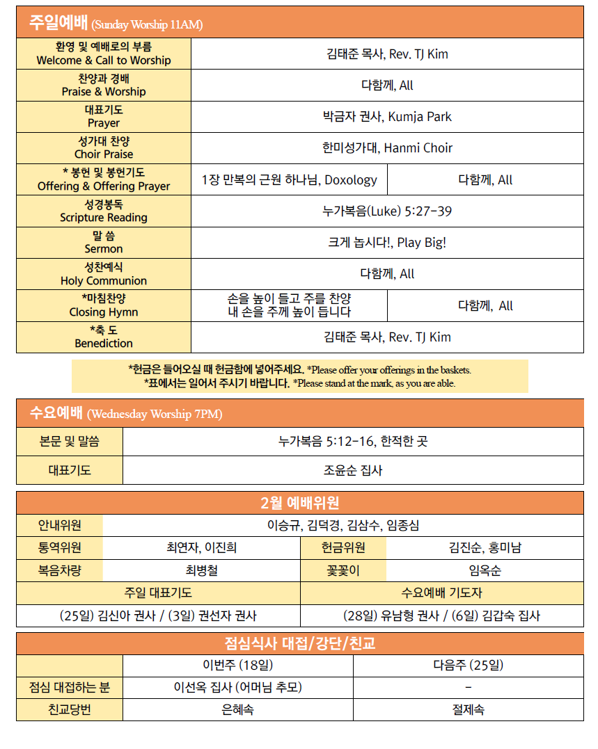 * 사순절 첫주일예배에 참석하신 여러분을 환영합니다! 사순절 기간동안 더 깊은 은혜의 자리로 나아가는 여러분이 되시기를 기도드립니다. 오늘 처음 오신 분은 예배 후 새가족 환영 테이블에서 담임목사님과 함께 점심식사를 해주시면 감사하겠습니다.