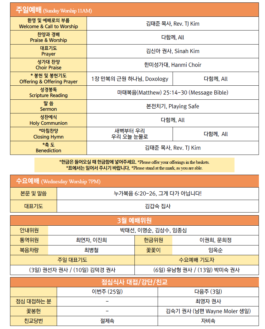 * 3월 16일(토) 10:30AM, Homeless Ministry, 교회에서 10시에 모입니다.