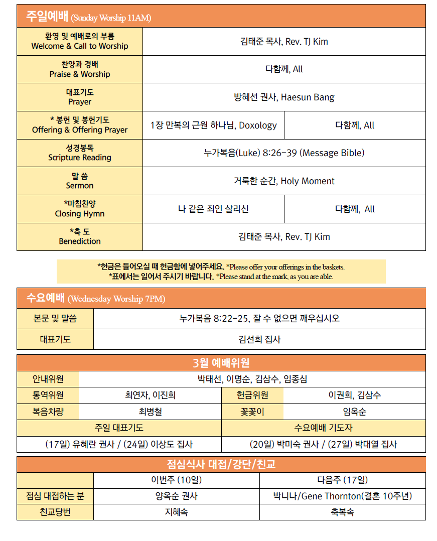 * 3월 16일(토) 10:30AM, Homeless Ministry, 교회에서 10시에 모입니다.
