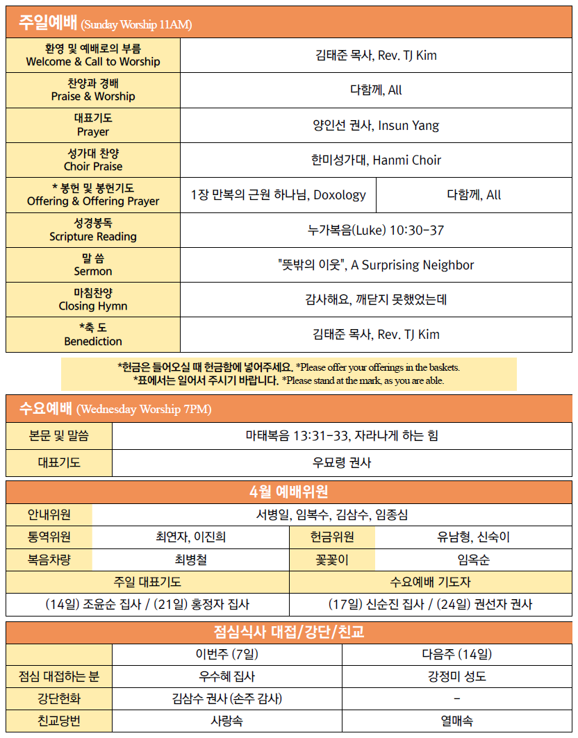 * 4월 20일(토) 10:30AM, Homeless Ministry, 10시에 모여 교회에 출발합니다.