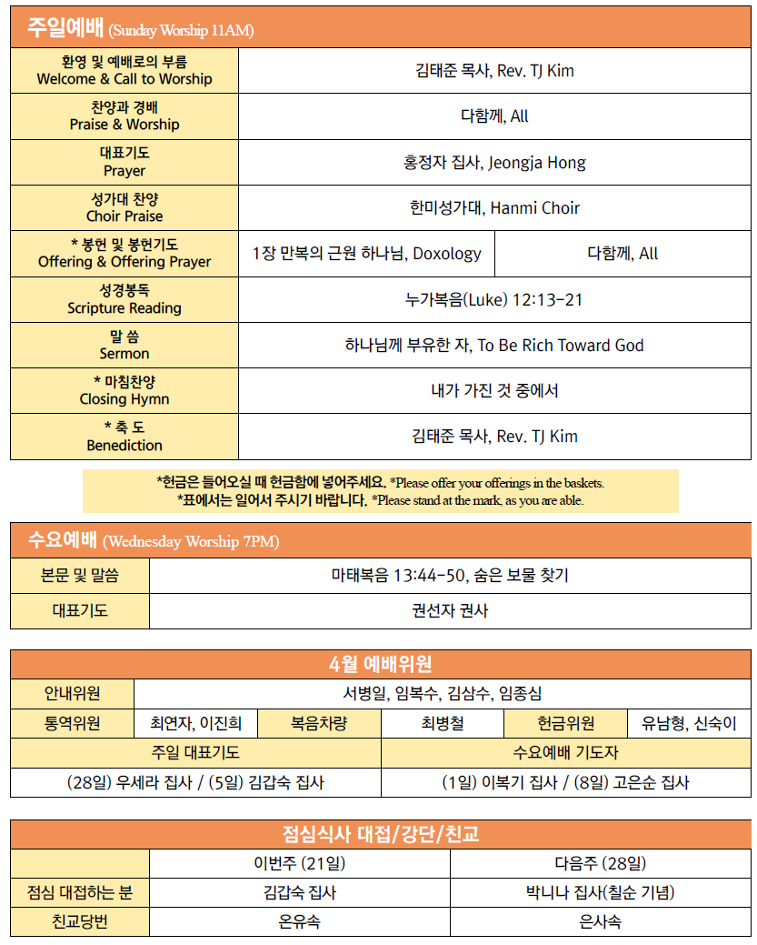 * Youth&College Group에서 매주 오후 2시까지 친교를 위해 Youth Chapel을 사용합니다. 예배 후에 각종 모임을 위한 장소가 필요하신 경우 사무실에 미리 연락해주시기 바랍니다.