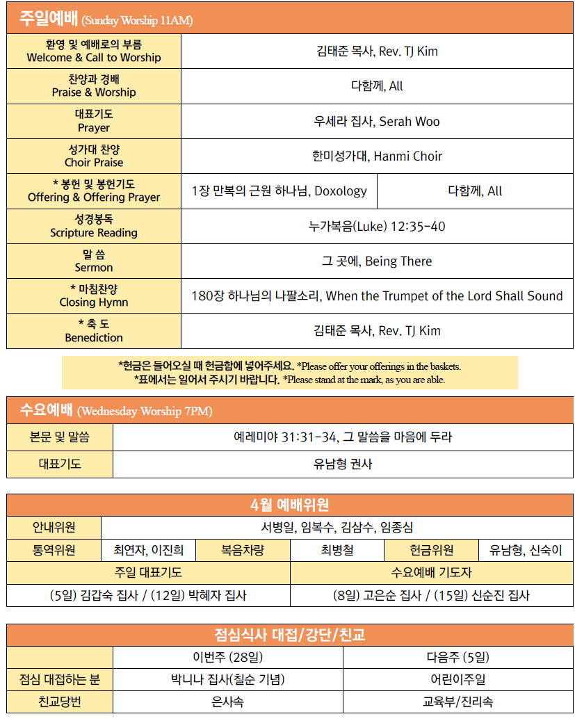 * Youth&College Group에서 매주 오후 2시까지 친교를 위해 Youth Chapel을 사용합니다. 예배 후에 각종 모임을 위한 장소가 필요하신 경우 사무실에 미리 연락해주시기 바랍니다.