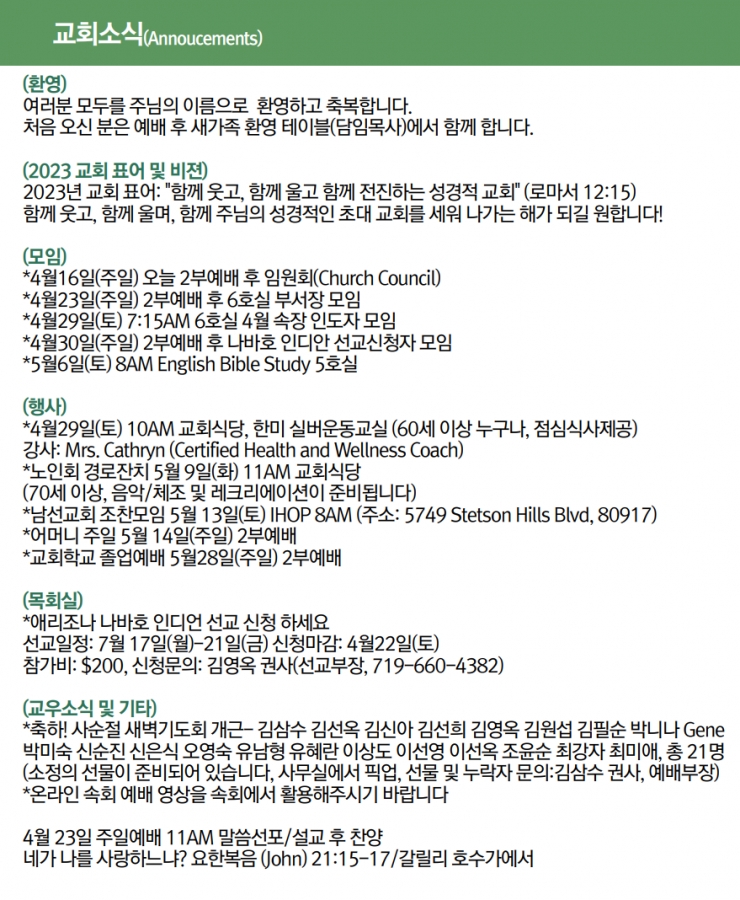 2023년 4월 16일 교회소식 페이지 정보 작성자 한미연합감리교회 조회 745회 작성일 23-04-22 06:00 목록 본문 2023년 4월 16일 교회소식 댓글 0 댓글목록 등록된 댓글이 없습니다. 목록