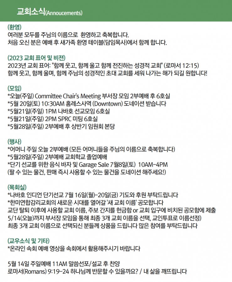 2023년 5월 14일 교회소식 페이지 정보 작성자 한미연합감리교회 조회 782회 작성일 23-05-14 02:59 목록 본문 2023년 5월 14일 교회소식 댓글 0 댓글목록 등록된 댓글이 없습니다. 목록