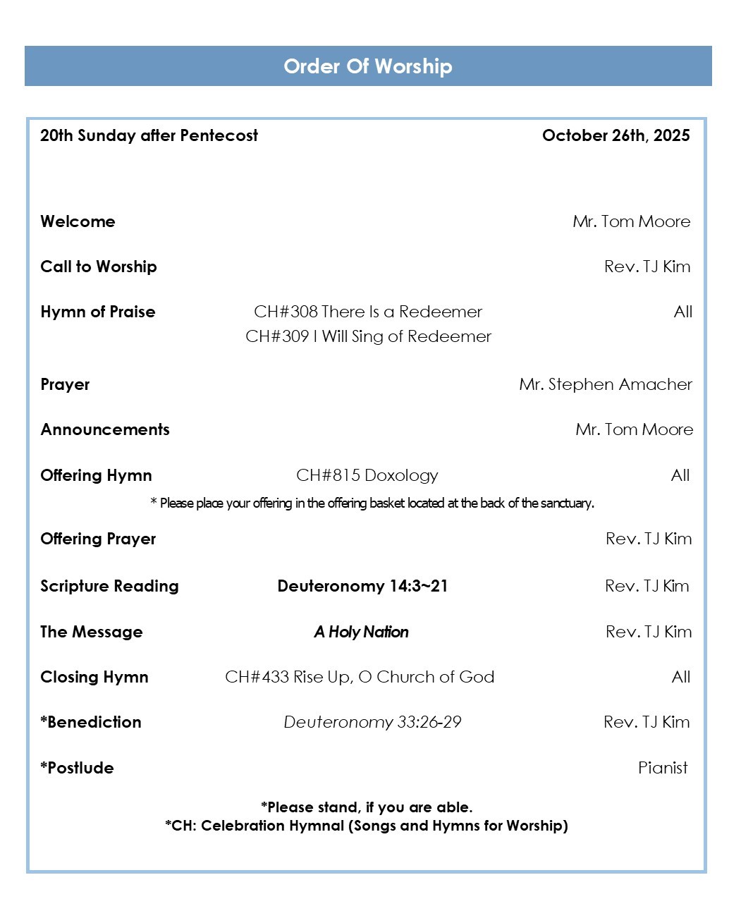 10/26/2025 - [EM] Announcemenet 페이지 정보 작성자 한미감리교회 조회 346회 작성일 25-10-25 12:40 목록 본문 크게보기 * Welcome! We are so glad that you are here to worship with us today! May this time of worship be an awesome opportunity to experience God’s abundant grace! * Bagels and coffee will not be available today and next Sunday due to ongoing construction. * Sunday School Class on “the 24 Articles of Religion” is being held in the Young Adults’ room, right after our Sunday Service. Please come down and join us! * Monthly Bible Study meets at 8:00 am, every second Saturday of month at church. We will be studying the Book of 1 Peter, Chapter 3, on November 8, led by Mr. Tom Moore. Everyone is invited. * Daylight Saving Time ends next Sunday. Don’t forget to set your clock back one hour, from 2 a.m. to 1 a.m. that morning. * The Small Group Talent Festival will be held on Sunday, November 16, following the 11 AM worship service. Each small group is asked to prepare a program of no more than 10 minutes to offer a praise of thanksgiving using the talents God has given. In addition to a grand prize (with a cash award), there will be various other prizes such as Participation Award, Effort Award, Most Touching Performance Award, and Cutest Performance Award. Let’s come together in unity to make this a joyful and abundant celebration of thanksgiving. * Construction in the fellowship hall will take place until November 7. * Due to the basement construction, today’s SEED Children’s Chapel and Imago Dei Youth Chapel will join the main worship service. After the children/youth sermon, each group will have a special event. The Children’s Ministry will go to the Pumpkin Patch (Longneck Pumpkin Farm, 7595 California Dr), and the Youth Group will go roller skating (Skate City Austin Bluffs, 4575 Austin Bluffs Pkwy). * Committee Meetings in preparation for the Annual Church Conference are scheduled as follows. All committee members are asked to attend: Board of Trustees (today), Finance Committee (11/2), Church Council (11/9), Annual Church Conference (11/30). 댓글 0 댓글목록 등록된 댓글이 없습니다. 목록