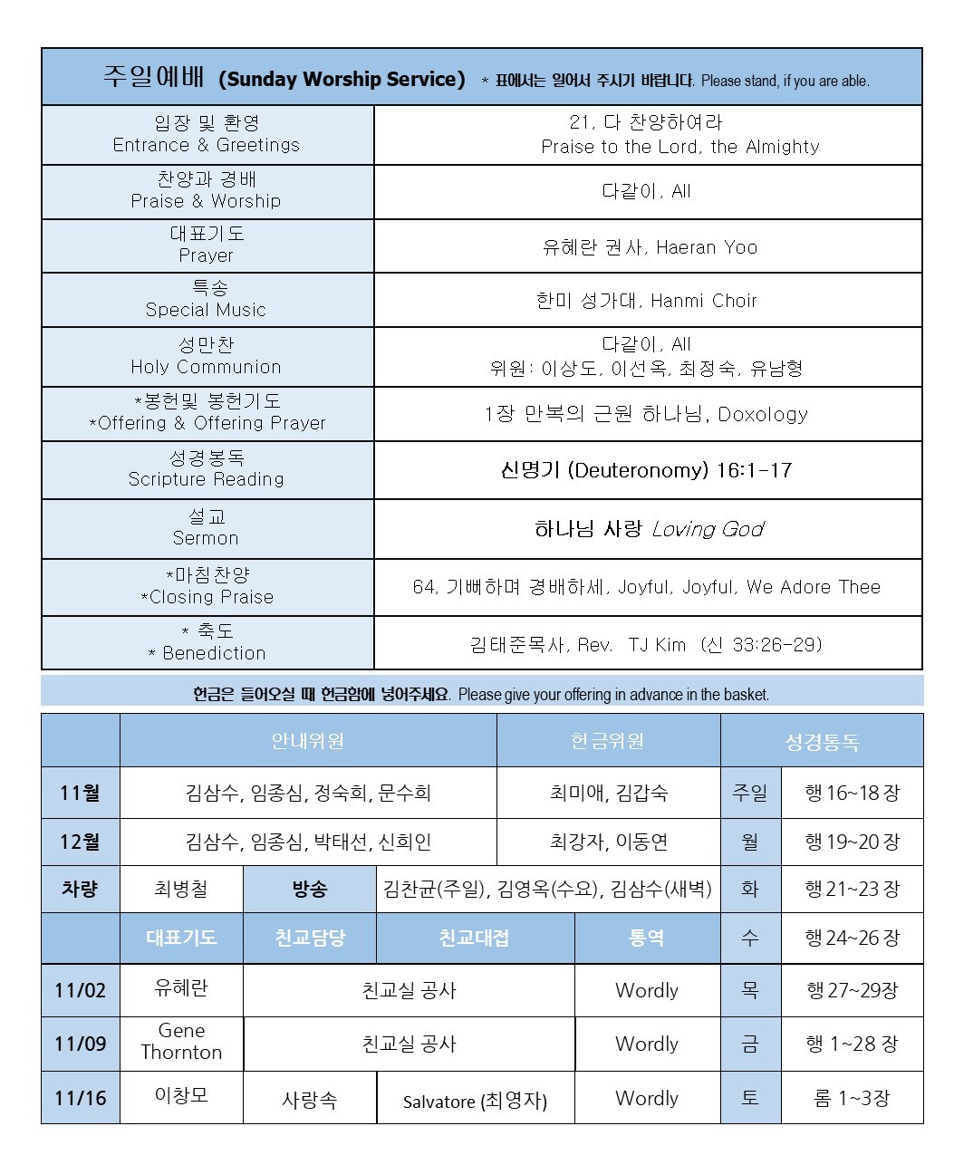 * 지난 주일 SEED Ministry와 Imago Dei Ministry 특별행사를 위해서 수고해 주신 스태프와 자원 봉사자 여러분께 감사를 드립니다.