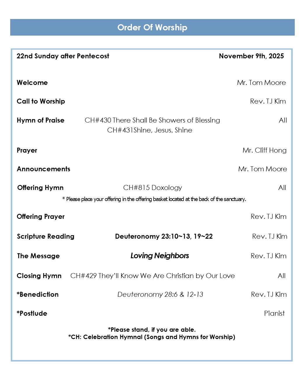 11/09/2025 - [EM] Announcement 페이지 정보 작성자 한미감리교회 조회 352회 작성일 25-11-08 14:05 목록 본문 Enlarge * Welcome! We are so glad that you are here to worship with us today! * Bagels and coffee will not be available today due to ongoing construction. * Today, there will be no Sunday School Class. * Monthly Bible Study meets at 8:00 am, every second Saturday of month at church. We will be studying the Book of 1 Peter, Chapter 3, on December 13, led by Mr. Gene Thornton. Everyone is invited. * Thank you to everyone who shared their stories during the first week of the “Sharing Thanks” campaign. (Gene Thornton, Oksun Rupe, Cliff Hong, Ki & Leanna Kim, Myo Chung). * If you would like to share your story for “Sharing Thanks”, please send it to the church email. (kamc0782@gmail.com) * Starting today, SEED Ministry Children Chapel and Imago Dei Youth Chapel will hold their worship services in their respective rooms. * The Small Group Talent Festival will be held on Sunday, December 7, following the 11 AM worship service. * Fellowship Hall Renovation Report: The first two phases of the construction is done. However, the schedule has been significantly delayed and we are still waiting for the final phase of the construction to be completed. Please continue to pray for the project. * Church Council will meet today in preparation for the upcoming Church Conference (11/30). All the council members are asked to attend. * Thanksgiving Sunday Joint worship will be held at 11 AM, November 23rd, followed by Thanksgiving Banquet. There will be no 9 AM service on that day. * The Christmas Praise Concert will be held at church at 7 PM, Wednesday, December 24. The event will feature performances by the Hanmi Choir, Glory, Chorus, SEED Ministry, Imago Dei, and guest musicians. May the beautiful music help us celebrate the joy of Christmas! * Hanging of the Green will be held on Saturday, November 29. Come and share in the joy of decorating our church for Advent and Christmas! * Lyle Olson underwent shoulder surgery last week. Please keep him in your prayers for a speedy and full recovery. 댓글 0 댓글목록 등록된 댓글이 없습니다. 목록