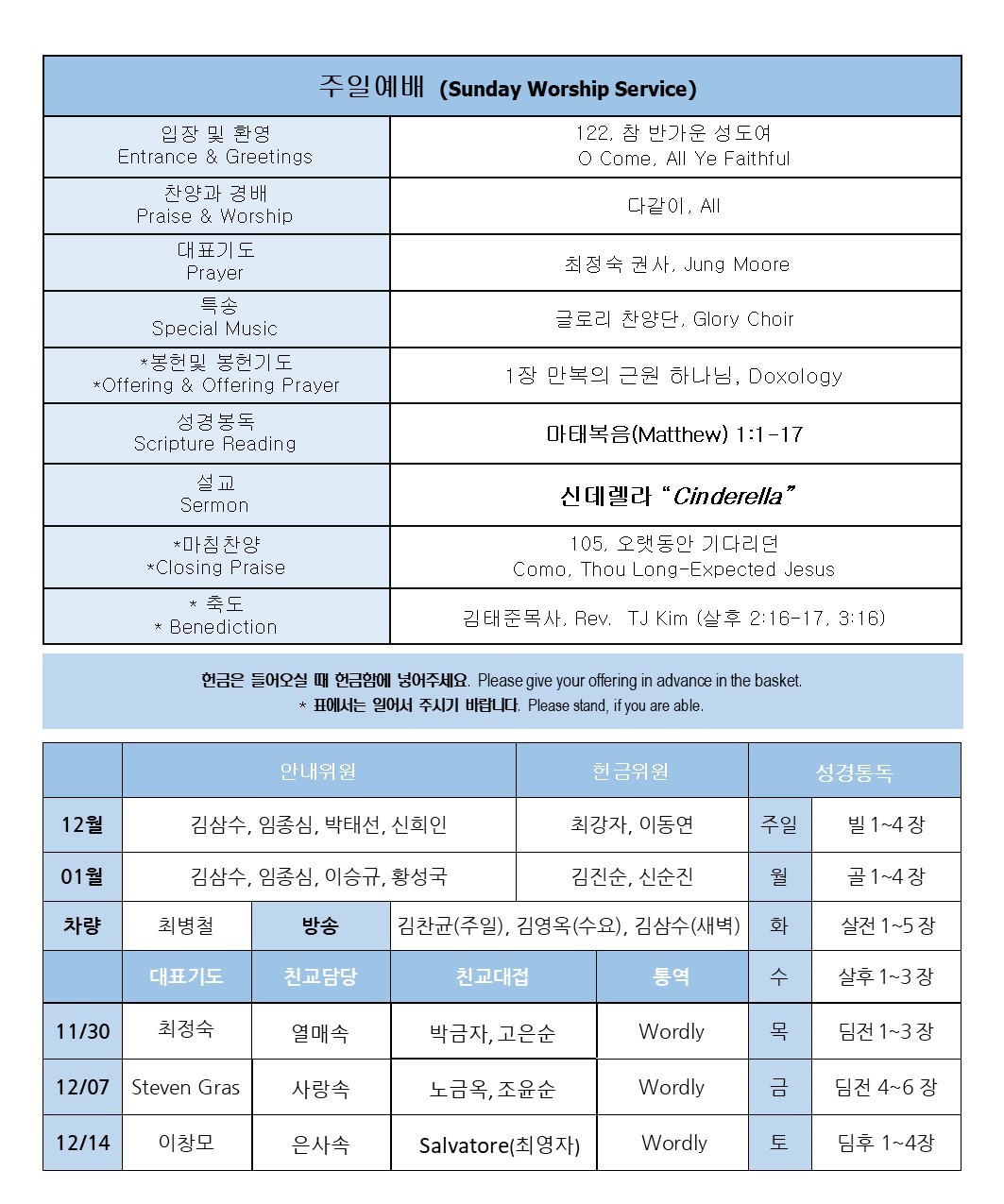 * 성탄주일 연합예배가 12월 21일 주일 오전 11시에 있습니다. 유아세례가 있을 예정입니다.(성탄주일에 유아세례나 세례 받기를 원하시는 분은 목회실에 알려 주시기 바랍니다.)