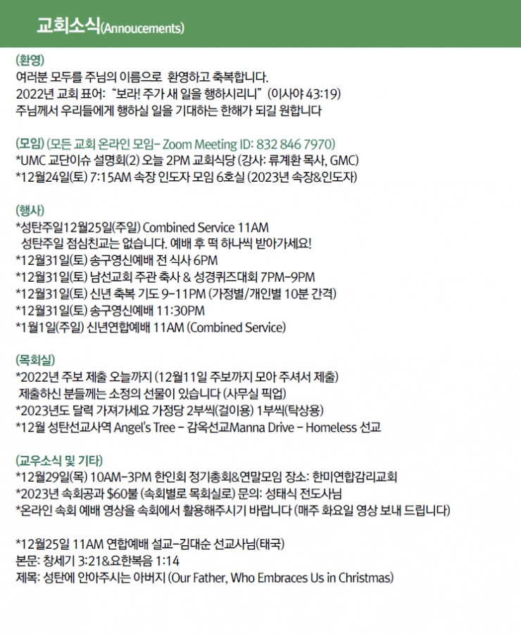 2022년 12월 18일 교회소식 페이지 정보 작성자 한미연합감리교회 조회 956회 작성일 22-12-17 10:03 목록 본문 2022년 12월 18일 교회소식 댓글 0 댓글목록 등록된 댓글이 없습니다. 목록