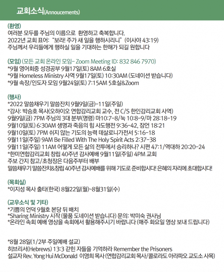 2022년 8월 21일 교회소식 페이지 정보 작성자 한미연합감리교회 조회 1,020회 작성일 22-08-26 07:13 목록 본문 2022년 8월 21일 교회소식 댓글 0 댓글목록 등록된 댓글이 없습니다. 목록