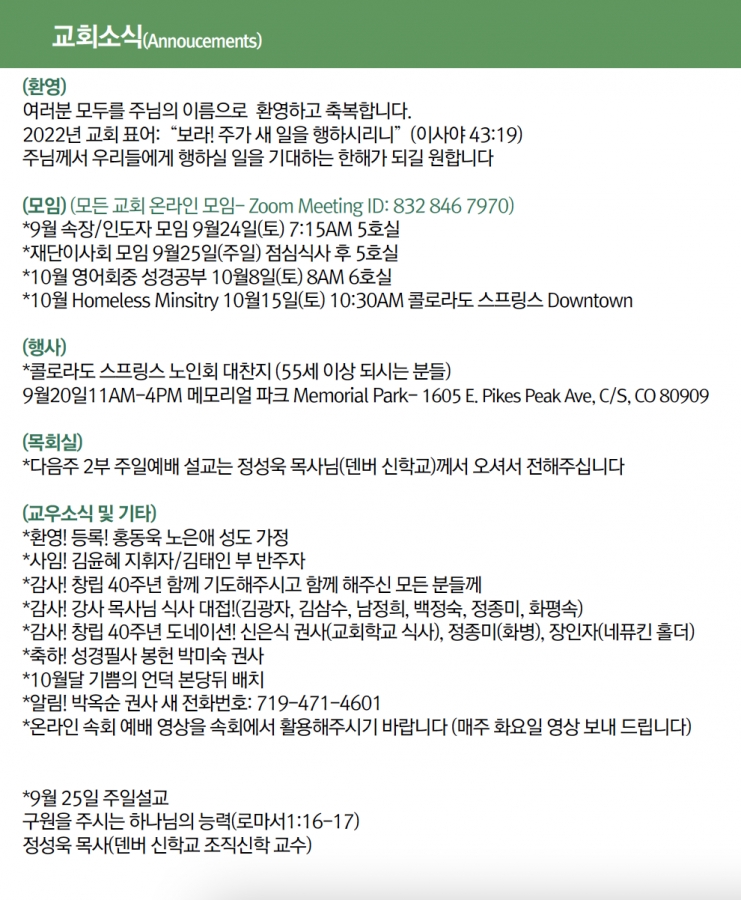2022년 9월 18일 교회소식 페이지 정보 작성자 한미연합감리교회 조회 987회 작성일 22-09-19 05:36 목록 본문 2022년 9월 18일 교회소식 댓글 0 댓글목록 등록된 댓글이 없습니다. 목록