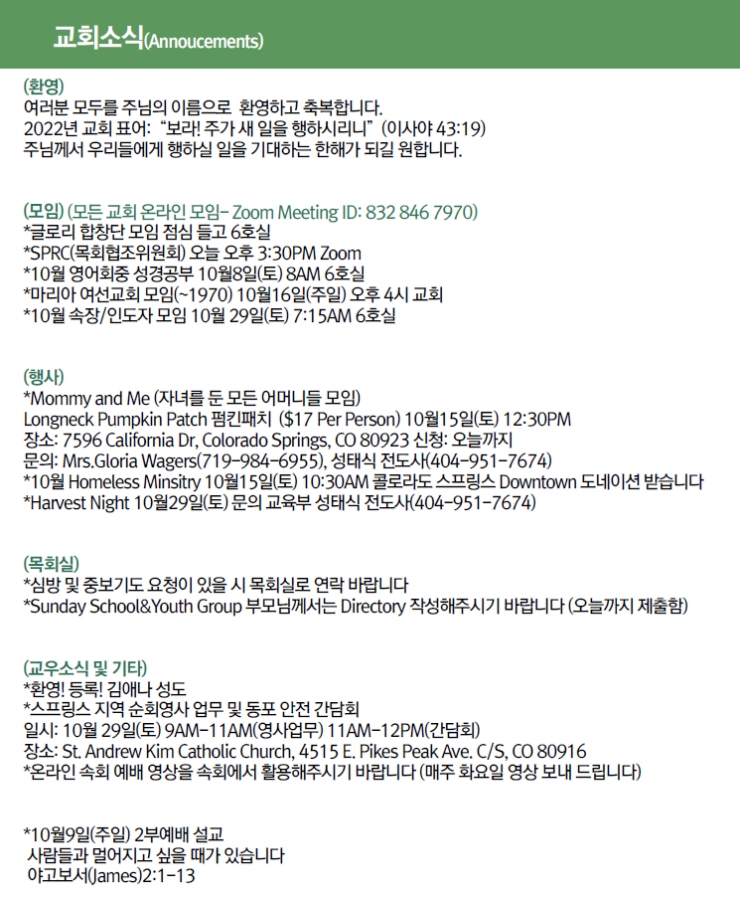 2022년 10월 2일 교회소식 페이지 정보 작성자 한미연합감리교회 조회 945회 작성일 22-10-01 23:56 목록 본문 2022년 10월 2일 교회소식 댓글 0 댓글목록 등록된 댓글이 없습니다. 목록