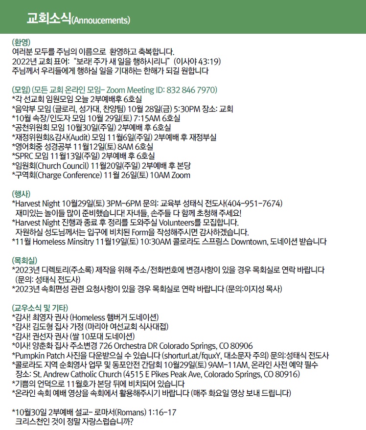 2022년 10월 23일 교회소식 페이지 정보 작성자 한미연합감리교회 조회 809회 작성일 22-10-24 01:14 목록 본문 2022년 10월 23일 교회소식 댓글 0 댓글목록 등록된 댓글이 없습니다. 목록