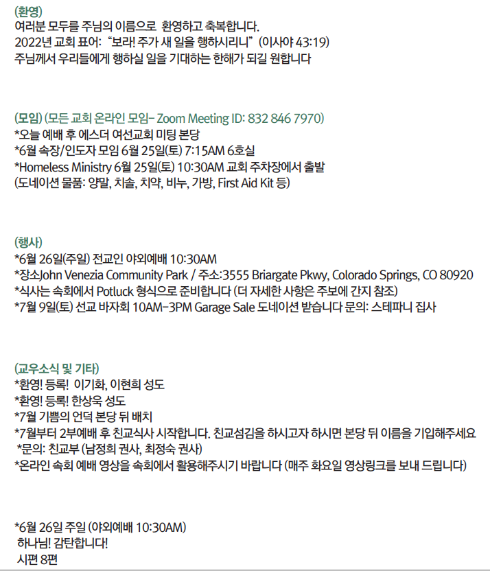 2022년 6월19일 교회소식 페이지 정보 작성자 한미연합감리교회 조회 969회 작성일 22-06-18 02:13 목록 본문 2022년 6월 19일 교회소식 댓글 0 댓글목록 등록된 댓글이 없습니다. 목록