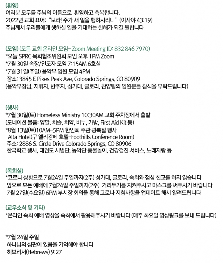 2022년 7월17일 교회소식 페이지 정보 작성자 한미연합감리교회 조회 912회 작성일 22-07-17 01:18 목록 본문 2022년 7월 17일 교회소식 댓글 0 댓글목록 등록된 댓글이 없습니다. 목록