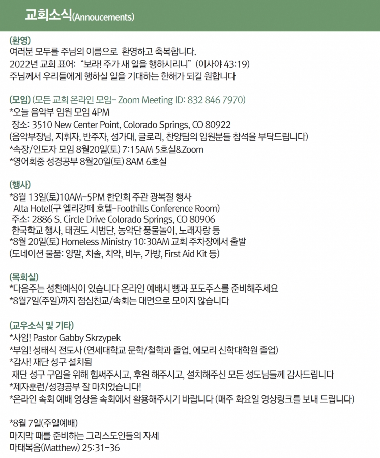 2022년 7월31일 교회소식 페이지 정보 작성자 한미연합감리교회 조회 966회 작성일 22-07-30 23:32 목록 본문 2022년 7월31일 교회소식 댓글 0 댓글목록 등록된 댓글이 없습니다. 목록