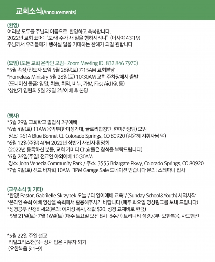 2022 5월15일 교회소식 페이지 정보 작성자 한미연합감리교회 조회 1,087회 작성일 22-05-14 12:17 목록 본문 2022 5월 15일 교회소식 댓글 0 댓글목록 등록된 댓글이 없습니다. 목록