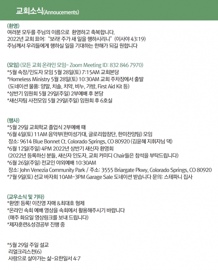 2022 5월22일 교회소식 페이지 정보 작성자 한미연합감리교회 조회 855회 작성일 22-05-22 03:28 목록 본문 2022 5월 22일 교회소식 댓글 0 댓글목록 등록된 댓글이 없습니다. 목록