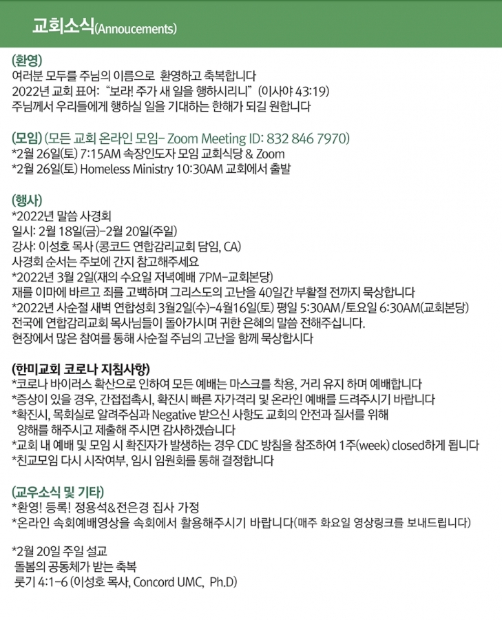 2월13일 교회소식 페이지 정보 작성자 한미연합감리교회 조회 895회 작성일 22-02-13 13:09 목록 본문 2월 13일 교회소식 댓글 0 댓글목록 등록된 댓글이 없습니다. 목록