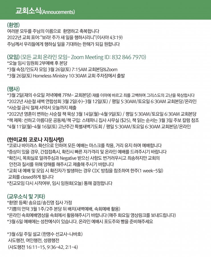 2022년 2월27일 교회소식 페이지 정보 작성자 한미연합감리교회 조회 909회 작성일 22-02-27 10:19 목록 본문 2022년 2월27일 교회소식 댓글 0 댓글목록 등록된 댓글이 없습니다. 목록