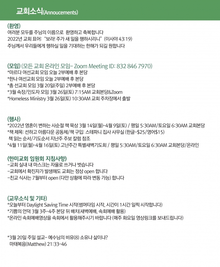 2022년 3월13일 교회소식 페이지 정보 작성자 한미연합감리교회 조회 922회 작성일 22-03-15 09:25 목록 본문 2022년 3월 13일 교회소식 댓글 0 댓글목록 등록된 댓글이 없습니다. 목록