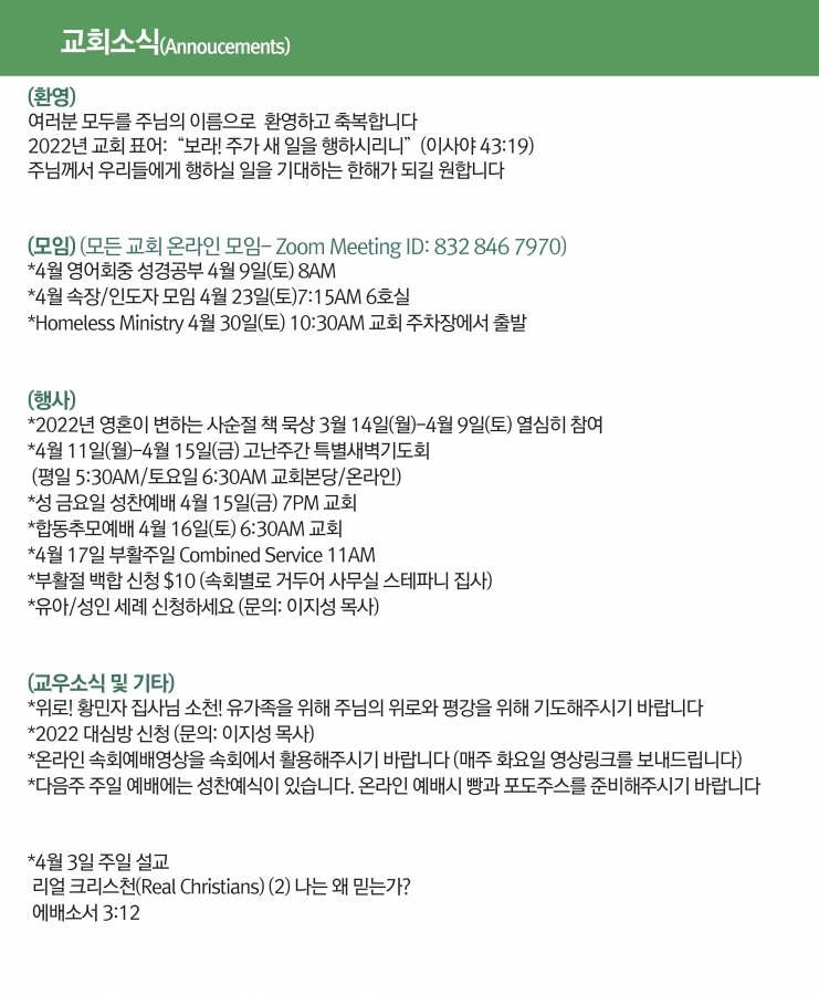 2022년 3월27일 교회소식 페이지 정보 작성자 한미연합감리교회 조회 919회 작성일 22-03-27 00:57 목록 본문 2022년 3월 27일 교회소식 댓글 0 댓글목록 등록된 댓글이 없습니다. 목록