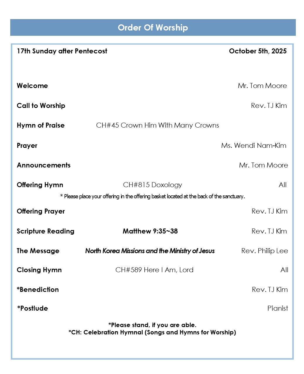 10/05/2025 - [EM] Announcement 페이지 정보 작성자 한미감리교회 조회 498회 작성일 25-10-04 13:24 목록 본문 크게보기 * Welcome! We are so glad that you are here to worship with us today! May this time of worship be an awesome opportunity to experience God’s abundant grace! (Holy communion in October will be observed on nest Sunday, October 12.) * Coffee & Bagel Fellowship! Bagel and coffee are available in the Fellowship Hall downstairs. Please come down and join us! * Today, there will be no Sunday School Class. * Monthly Bible Study meets at 8:00 am, next Saturday (11th) at church. We will be studying the Book of 1 Peter Chapter 2, led by Mr. Lonnie Mead. Everyone is invited. * We give thanks to Rev. Philip Lee for sharing today’s message, and we also thank everyone who treated the pastor and his family to a meal. The pastor will be leaving for LA tomorrow (10/06). * The Newcomers’ Welcome Reception will be held on next Sunday, October 12. The newcomers’ class will begin at 1:00 PM, followed by the welcome fellowship at 2:00 PM. * Thanksgiving Story Campaign: Throughout the month of October, we are collecting your stories of thanksgiving along with a photo. Please submit your story via KakaoTalk or directly to the pastor’s office by October 26. Twenty selected stories will receive a prize and will be shared on the church website during November. * The Small Group Talent Festival will be held on Sunday, November 16, following the 11 AM worship service. Each small group is asked to prepare a program of no more than 5 minutes to offer a praise of thanksgiving using the talents God has given. In addition to a grand prize (with a cash award), there will be various other prizes such as Participation Award, Effort Award, Most Touching Performance Award, and Cutest Performance Award. Let’s come together in unity to make this a joyful and abundant celebration of thanksgiving. * Construction in the fellowship hall will take place for 2 weeks from Oct. 20. * Committee Meetings in preparation for the Annual Church Conference are scheduled as follows. All committee members are asked to attend: Nominations Committee (10/05), SPRC (10/19), Board of Trustees (10/26), Finance Committee (11/2), Church Council (11/9), Annual Church Conference (11/30). 댓글 0 댓글목록 등록된 댓글이 없습니다. 목록