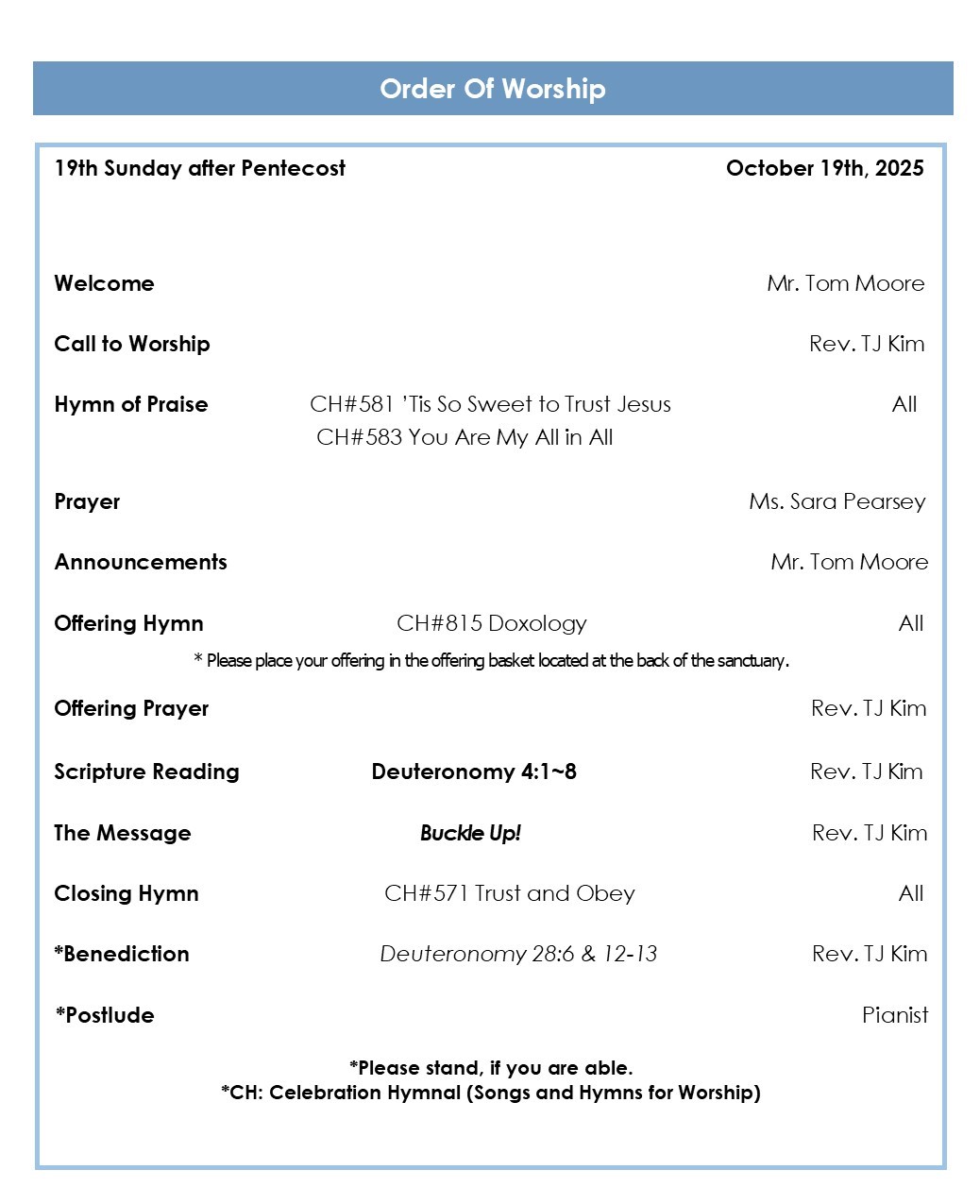 10/19/2025 - [EM] Announcement 페이지 정보 작성자 한미감리교회 조회 449회 작성일 25-10-18 14:26 목록 본문 크게보기 * Welcome! We are so glad that you are here to worship with us today! May this time of worship be an awesome opportunity to experience God’s abundant grace! * Coffee & Bagel Fellowship! Bagel and coffee are available in the Fellowship Hall downstairs. Please come down and join us! * Today, there will be no Sunday School Class.* Monthly Bible Study meets at 8:00 am, every second Saturday of month at church. We will be studying the Book of 1 Peter, Chapter 3, on November 8, led by Mr. Tom Moore. Everyone is invited.* Thanksgiving Story Campaign: Throughout the month of October, we are collecting your stories of thanksgiving along with a photo. Please submit your story via KakaoTalk or directly to the pastor’s office by October 26. Twenty selected stories will receive a prize and will be shared on the church website during November. * The Small Group Talent Festival will be held on Sunday, November 16, following the 11 AM worship service. Each small group is asked to prepare a program of no more than 5 minutes to offer a praise of thanksgiving using the talents God has given. In addition to a grand prize (with a cash award), there will be various other prizes such as Participation Award, Effort Award, Most Touching Performance Award, and Cutest Performance Award. Let’s come together in unity to make this a joyful and abundant celebration of thanksgiving. * We appreciate all who took part in and yesterday’s Homeless Mission.* Construction in the fellowship hall will take place for 2 weeks from tomorrow.* Committee Meetings in preparation for the Annual Church Conference are scheduled as follows. All committee members are asked to attend: SPRC (10/19), Board of Trustees (10/26), Finance Committee (11/2), Church Council (11/9), Annual Church Conference (11/30). 댓글 0 댓글목록 등록된 댓글이 없습니다. 목록