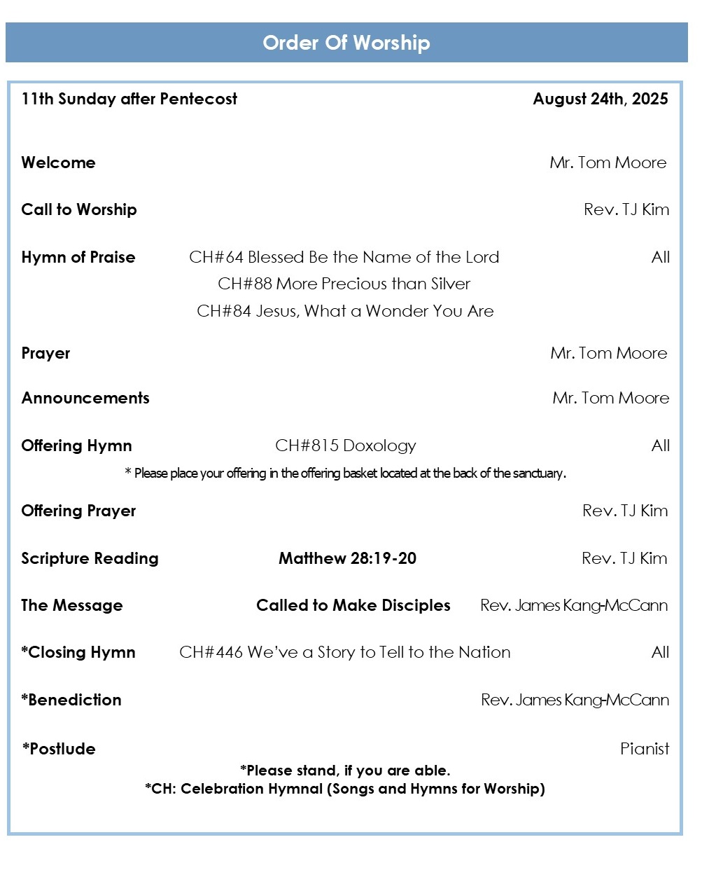 We are deeply grateful to Rev. James Kang-McCaan for delivering the
