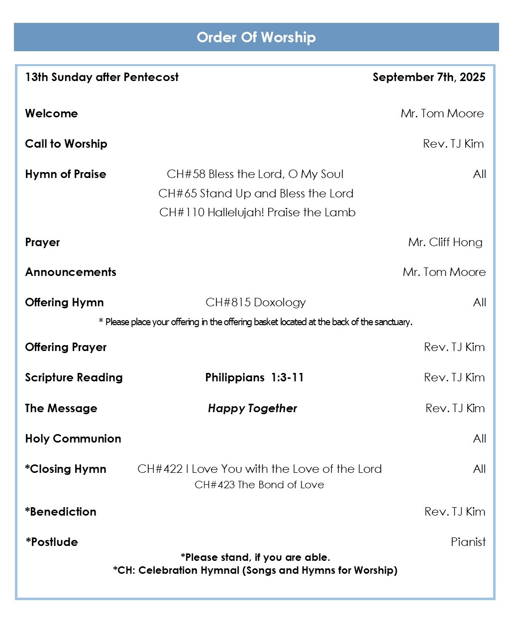 * Starting today, Rev. Daniel Kim will be leading the Youth/College Ministry, and Ms. Hyeyeong Lee will be leading the praise team. We ask for your support and prayers.
