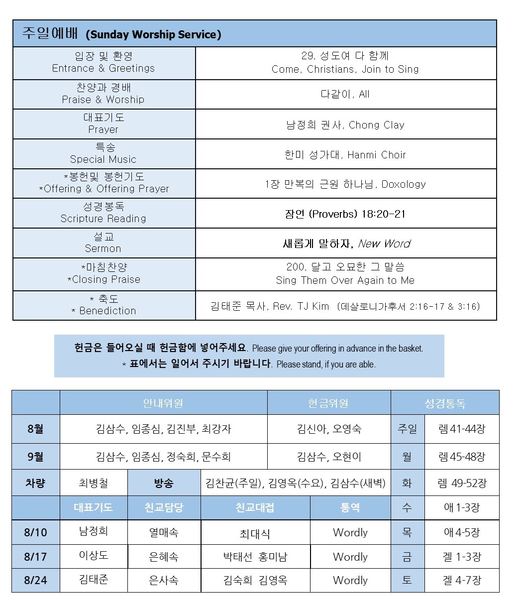 * 8월 정기 임원회가 8월 17일, 주일, 오후 1시에 청년부실에서 모입니다.