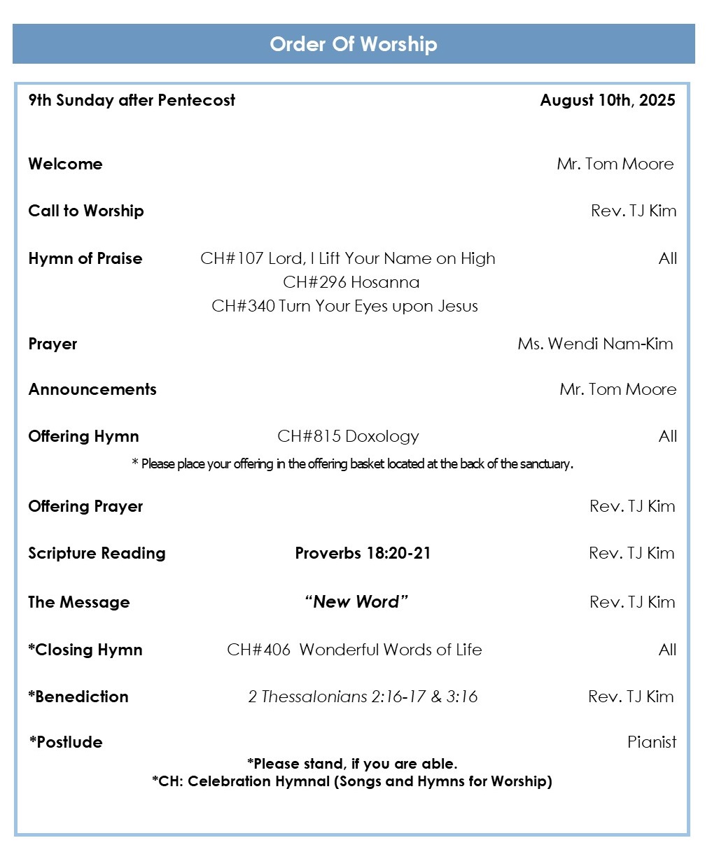 * Mission Revival will be held from Friday, August 22 to Sunday, August 24 with Rev. James Kang-McCann. Let us come together to renew our response to God’s missional calling. English services will be held on Saturday evening and during the Sunday First Service. We warmly invite everyone to this special time of worship, reflection, and spiritual renewal.