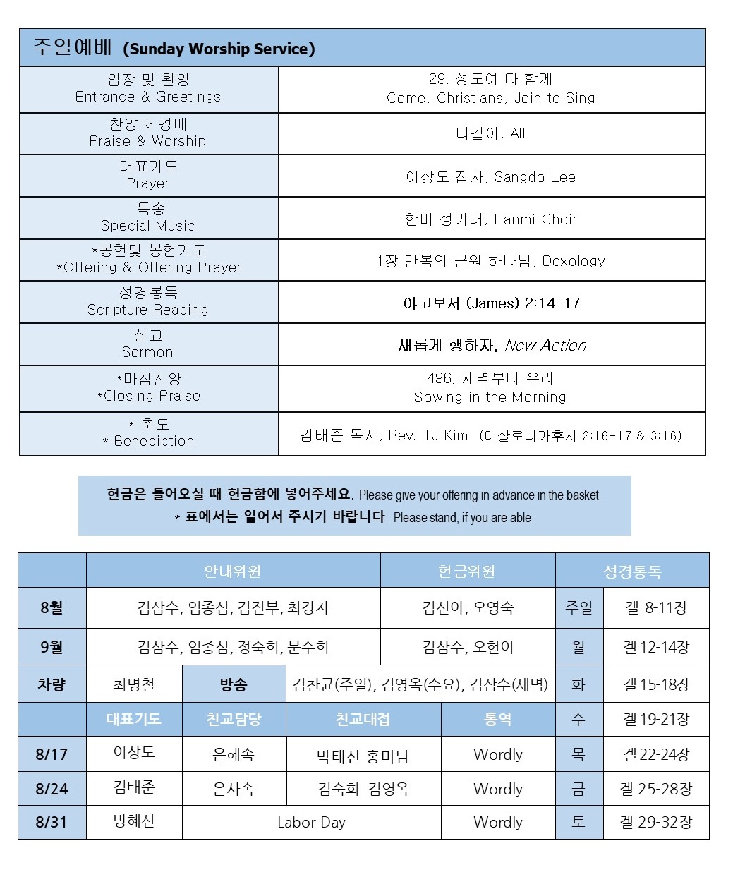 * 창립 43주년을 맞아 선교 부흥회가 강영철 선교사님(Rev. James Kang-McCann) 모시고 오는 8월 22일(금)부터 24일(주일)까지 열립니다.