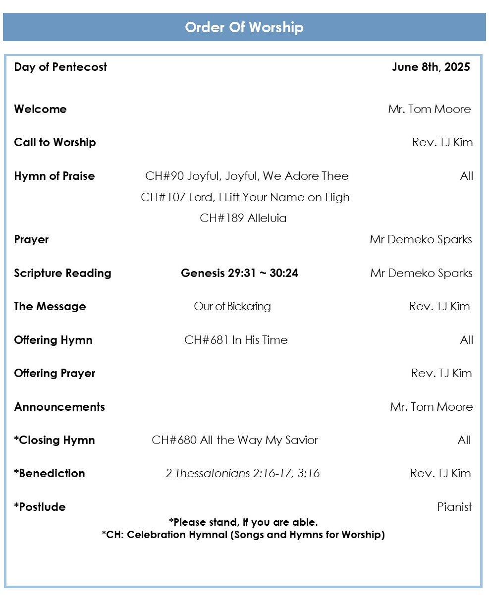 * Vacation Bible School will be held from June 19 to 21 under the theme “Trusting Jesus in a Wild World.” For more information, please contact Rev. Gurung of the Children’s Ministry. We also welcome anyone who is willing to serve and help with VBS. VBS decorations will begin this Saturday afternoon (the 14th). Your help and participation would be greatly appreciated!