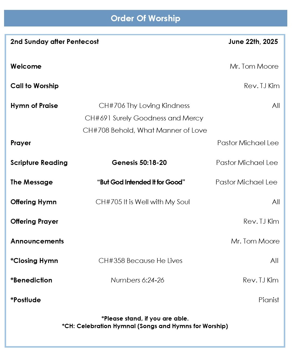 * We will need about two grills (gas only) for the outdoor service. If you are able to bring one, please contact Mr. Chan-Kyun Kim, President of the Men’s Fellowship. Those who are able to assist with transporting tents and tables for the service are asked to arrive at the church by 8 am. on the day of the event.